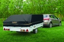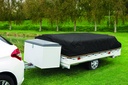 De voortent kan met/in het grondzeil opgevouwen worden op het bovenste bed op de ingevouwen wagen onder het dekzeil (meer bergruimte in de wagenbak). Zie video.