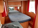 De camper heeft een queensbed en een ruime zitgroep en is toch nog geen 7 meter lang. Achterin is een goed toegankelijk queensbed (195×135) met ernaast en boven voldoende kastruimte. De zitgroep heeft veel daglicht door twee grote dakluiken en bestaat uit 2 banken en draaibare cabinestoelen, de banken kunnen worden omgebouwd tot een extra bed (190×60).