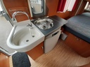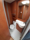 De natcel heeft door een extra tussenwand ruimte voor een wasbak en toilet en een douche. De keuken is voorzien van een wasbak en 3 pits gasstel en koelkast, met extra keukenblad door een opklapbaar zijstuk.